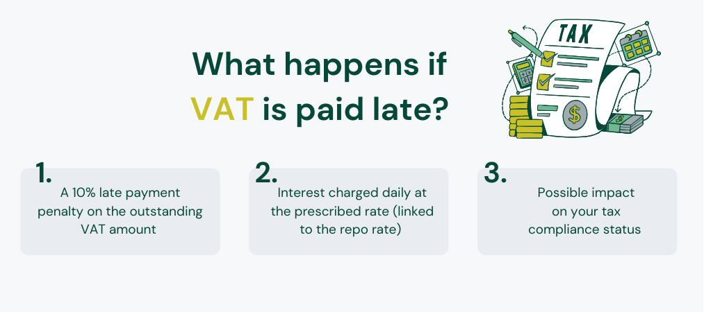 In South Africa, VAT vendors must submit their VAT201 return and make payment by the prescribed deadline. For most vendors, this is the 25th of the relevant month, or the last business day of the month when filing and paying via eFiling.